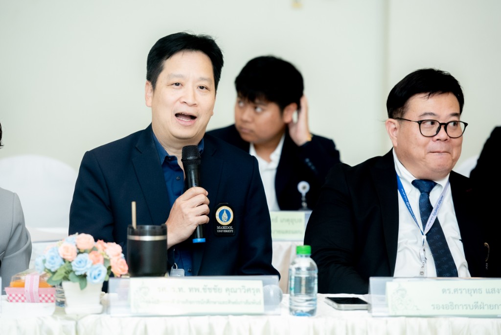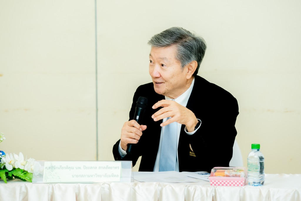 วันที่ 13 มิถุนายน 2568 ศาสตราจารย์คลินิกเกียรติคุณ นายแพทย์ปิยะสกล สกลสัตยาทร นายกสภามหาวิทยาลัยมหิดล พร้อมด้วยกรรมการสภามหาวิทยาลัยมหิดล และทีมผู้บริหาร รับฟังผลการดำเนินงานของส่วนงาน (University Council Visit : 4) ครั้งที่ 5/2568 ของวิทยาลัยศาสนศึกษา มหาวิทยาลัยมหิดล และรับฟังผลการดำเนินงานที่ผ่านมา รวมทั้งการพัฒนาและความท้าทายในอนาคต โดยมี ผู้ช่วยศาสตราจารย์ ดร.ไพเราะ มากเจริญ คณบดีวิทยาลัยศาสนศึกษา มหาวิทยาลัยมหิดล พร้อมด้วยคณะผู้บริหาร คณาจารย์ และบุคลากร เข้าร่วมรับฟังความคิดเห็น ณ ห้องประชุมน้ำทอง คุณวิศาล วิทยาลัยศาสนศึกษา มหาวิทยาลัยมหิดล ศาลายา โดยมีประเด็นดังต่อไปนี้
