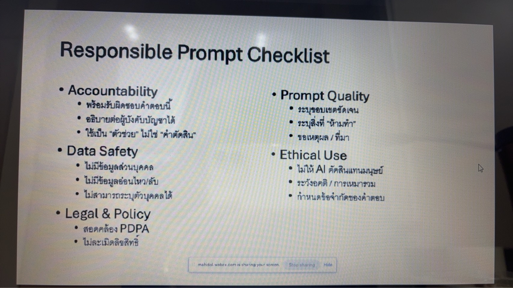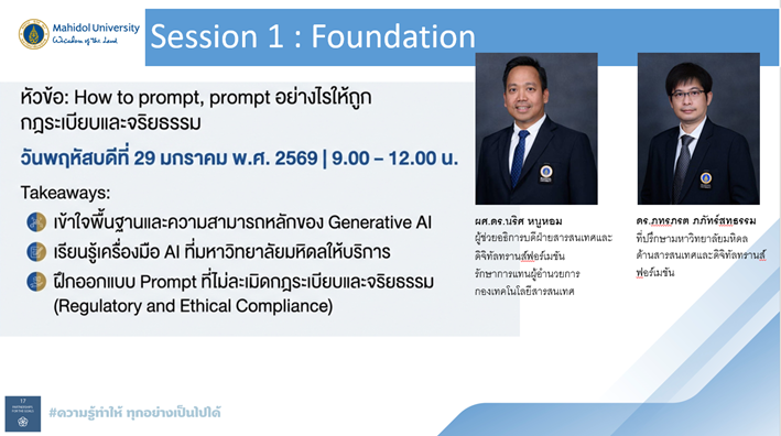 เมื่อวันพฤหัสบดีที่ 29 มกราคม พ.ศ. 2569 เวลา 9.00-12.00 น. ณ ห้องประชุม 530 ชั้น 5 อาคารสำนักงานอธิการบดี มหาวิทยาลัยมหิดล ศาลายา โดยได้รับเกียรติจากผู้ช่วยศาสตราจารย์ ดร.นริศ หนูหอม ผู้ช่วยอธิการบดีฝ่ายสารสนเทศและดิจิทัลทรานส์ฟอร์เมชัน รักษาการแทนผู้อำนวยการกองเทคโนโลยีสารสนเทศ และ ดร.ภทรภรต ภภัทร์สทธรรม ที่ปรึกษามหาวิทยาลัยมหิดลด้านสารสนเทศและดิจิทัลทรานส์ฟอร์เมชัน เป็นวิทยากรถ่ายทอดองค์ความรู้ สำหรับการใช้ปัญญาประดิษฐ์ บรรยายในหัวข้อ “How to prompt, prompt อย่างไรให้ถูก กฎระเบียบและจริยธรรม (Regulatory and Ethical Compliance)” เพื่อเข้าใจพื้นฐานและความสามารถหลักของ Generative  Artificial Intelligence, AI และเพิ่มพูนความรู้ ความเข้าใจ สร้างทักษะเกี่ยวกับ AI ที่มหาวิทยาลัยมหิดลให้บริการแก่บุคลากร เพื่อบุคลากรสามารถออกแบบและพัฒนา Prompt สำหรับการใช้งาน AI อย่างถูกต้อง และไม่ละเมิดกฎระเบียบ จริยธรรม) โดย ผู้บริหารและบุคลากรสำนักงานสภามหาวิทยาลัย ได้ร่วมเรียนรู้และถาม–ตอบ เพื่อเสริมสร้างความเข้าใจและเตรียมความพร้อมในการนำ Generative AI ไปใช้ในการพัฒนาองค์กร ทั้งนี้ ครั้งต่อไป คณะทำงานฯ จะจัดการบรรยาย ในหัวข้อ “การพัฒนาทักษะความเข้าใจและการใช้เทคโนโลยีปัญญาประดิษฐ์ Generative AI for UC Operation System” วันพฤหัสบดีที่ 26 กุมภาพันธ์ พ.ศ. 2569 เวลา 9.00 – 12.00 น. ณ ห้องประชุม 530 ชั้น 5 อาคารสำนักงานอธิการบดี มหาวิทยาลัยมหิดล ศาลายา โดยได้รับเกียรติจากผู้ช่วยศาสตราจารย์ ดร.ทิพาจินต์ ไทยพิสุทธิกุล  ผู้ช่วยอธิการบดีฝ่ายวิจัย และ อาจารย์ประจำกลุ่มวิชาวิทยาการคอมพิวเตอร์ ผู้ช่วยคณบดีฝ่ายบริการวิชาการและถ่ายทอดเทคโนโลยี คณะเทคโนโลยีสารสนเทศและการสื่อสาร เป็นวิทยากรในลำดับต่อไป